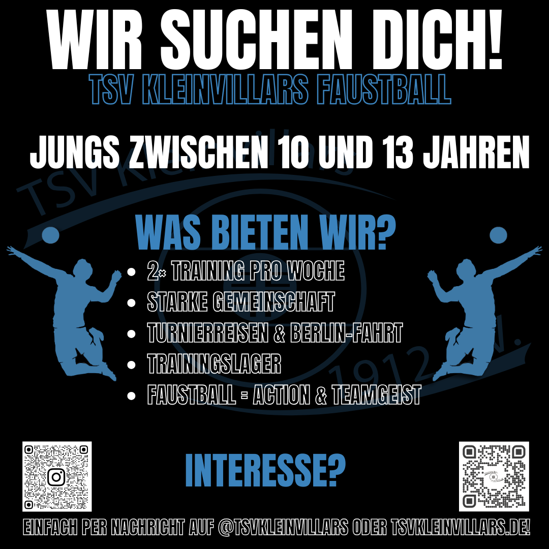 Der TSV Kleinvillars Faustball sucht sportbegeisterte Jungs zwischen 10 und 13 Jahren, die Lust auf Action, Teamgeist und eine richtig starke Gemeinschaft haben. Bei uns bekommst du: • 2× Training pro Woche • Turnierreisen & jährliche Berlin-Fahrt • Trainingslager mit allen Jugendteams • Ein motiviertes Trainerteam • Jede Menge Spaß, Bewegung und neue Freunde Wir gehören zu den aktivsten Faustballvereinen der Region – mit regelmäßigen Meisterschaftsteilnahmen, starken Jugendteams und großen Vereinsaktionen. Interesse? Melde dich einfach per Nachricht oder direkt über unsere Homepage: https://www.tsvkleinvillars.de Instagram: @tsvkleinvillars