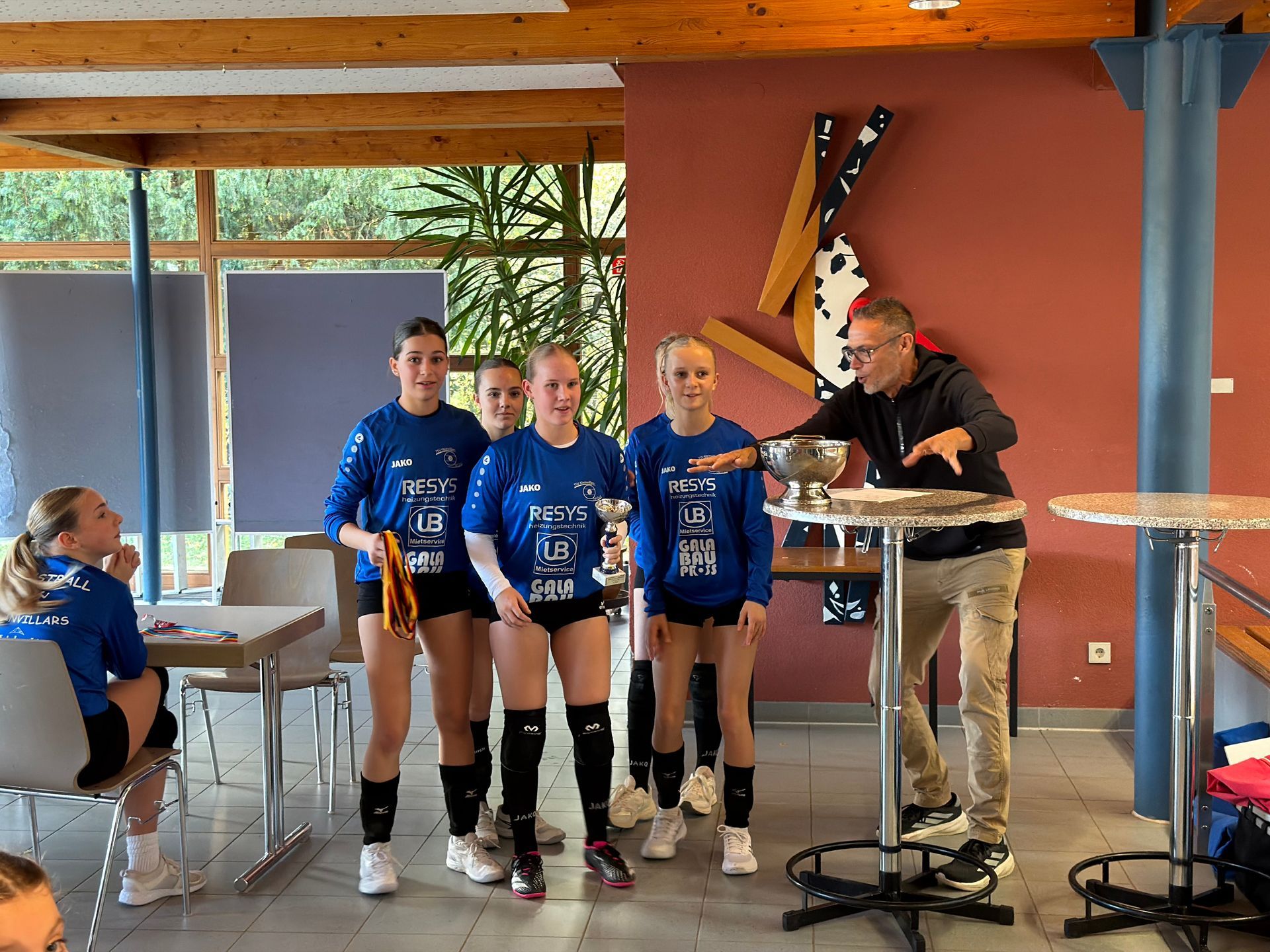 Beim Rückrundenspieltag der U14w in der Schwarzwaldhalle Birkenfeld war der TSV Kleinvillars mit drei Teams vertreten. Alle Mannschaften zeigten engagierte Auftritte und sicherten sich wichtige Punkte in der Vorrundengruppe B. TSV Kleinvillars 1 startete mit einem knappen 0:2 gegen Unterhaugstett, steigerte sich anschließend jedoch deutlich und gewann souverän gegen Hohenklingen (11:3, 11:4) sowie Obernhausen (11:7, 11:2). TSV Kleinvillars 2 erwischte einen guten Auftakt mit einem 2:0-Sieg über Hohenklingen. Gegen Unterhaugstett musste sich das Team klar geschlagen geben, holte aber im letzten Spiel ein stark erkämpftes 1:1 gegen Obernhausen. TSV Kleinvillars 3 zeigte trotz einer Auftaktniederlage gegen Obernhausen eine stabile Leistung. Gegen Hohenklingen erspielte sich das Team ein verdientes 1:1 und zeigte auch in den übrigen Partien gute Aktionen. Durch die gezeigten Leistungen qualifizieren sich alle drei Mannschaften des TSV Kleinvillars für die Zwischenrunde am 18.01.26 – ein großer Erfolg für den Verein und die gesamte U14-Abteilung. Für den TSV Kleinvillars spielten: Team 1: Maxi, Mayla, Jana, Georgia, Lea Team 2: Mara, Henni, Fiona, Lilia, Carla Team 3: Narin, Sara, Lilian, Ella, Tamina, Samira